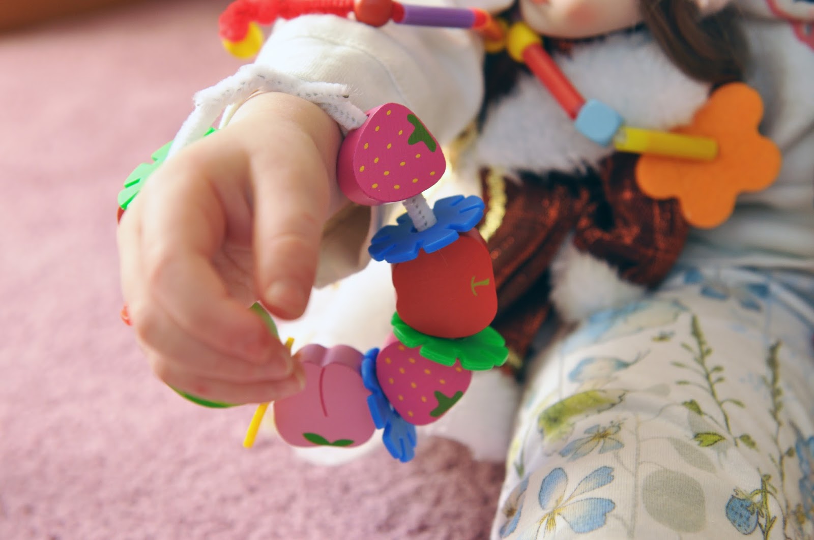 Дочка вообще очень любит завешивать себя бусами, разбирать свои банкики, заколочки, браслетик. В волосы ничего закалывать не разрешает, но рассматривать, перебирать, раскладывать по полу очень любит.